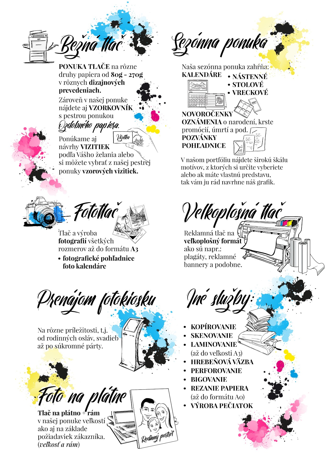 Viac informácií o našej ponuke a novinkách aj na našom facebookovom profile. Základnú cenovú ponuku tlače nájdeš tu na našom WEBE a pre viac info. nás môžeš kontaktovať formou emailu@ alebo na našom facebookovom profile.